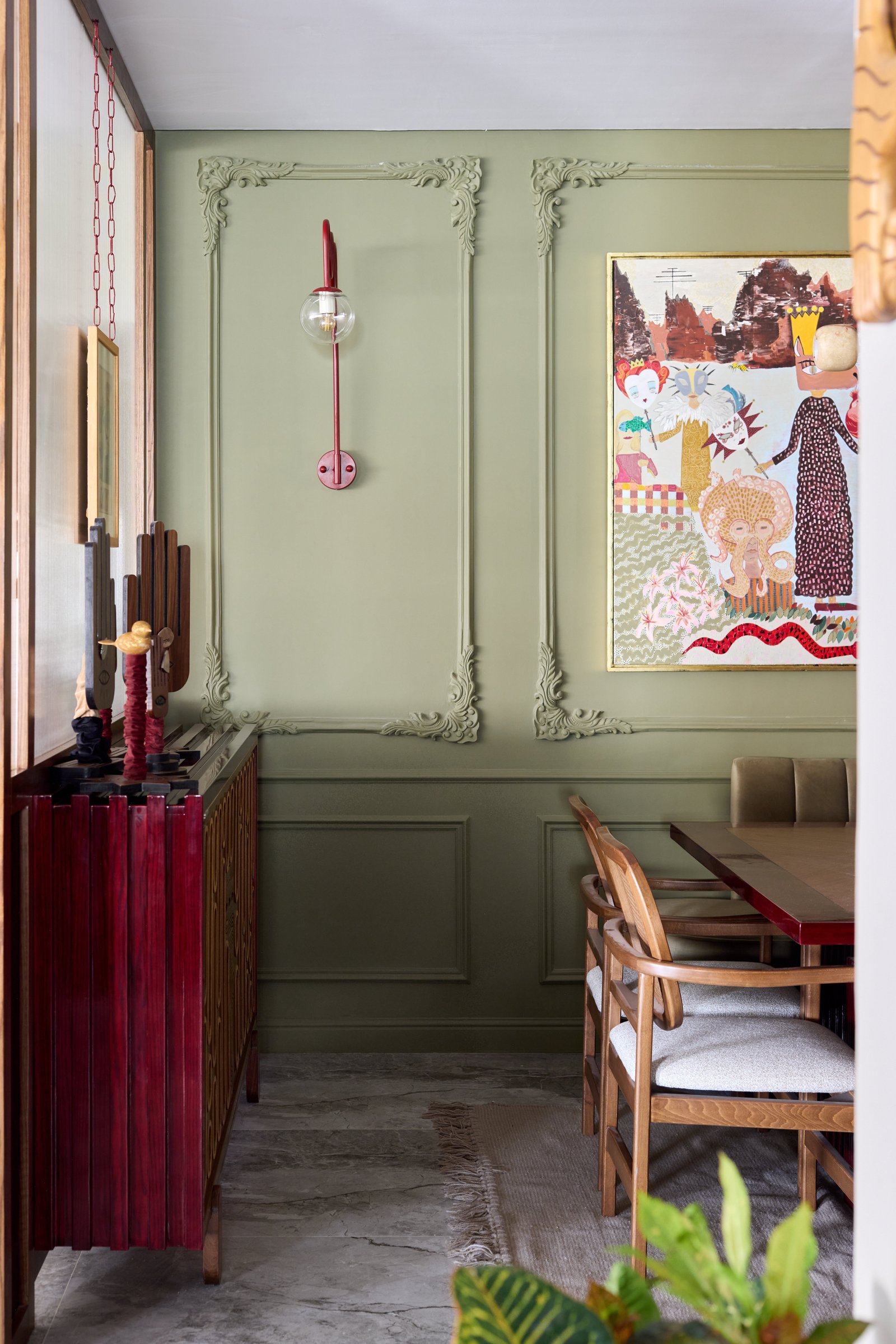 This cozy corner blends natural textures and earthy tones. A green stool and speckled planter with a fiddle-leaf fig add freshness, while marble tiles and a patterned rug bring elegance and warmth. The mix of greenery and traditional accents creates a peaceful, inviting space.