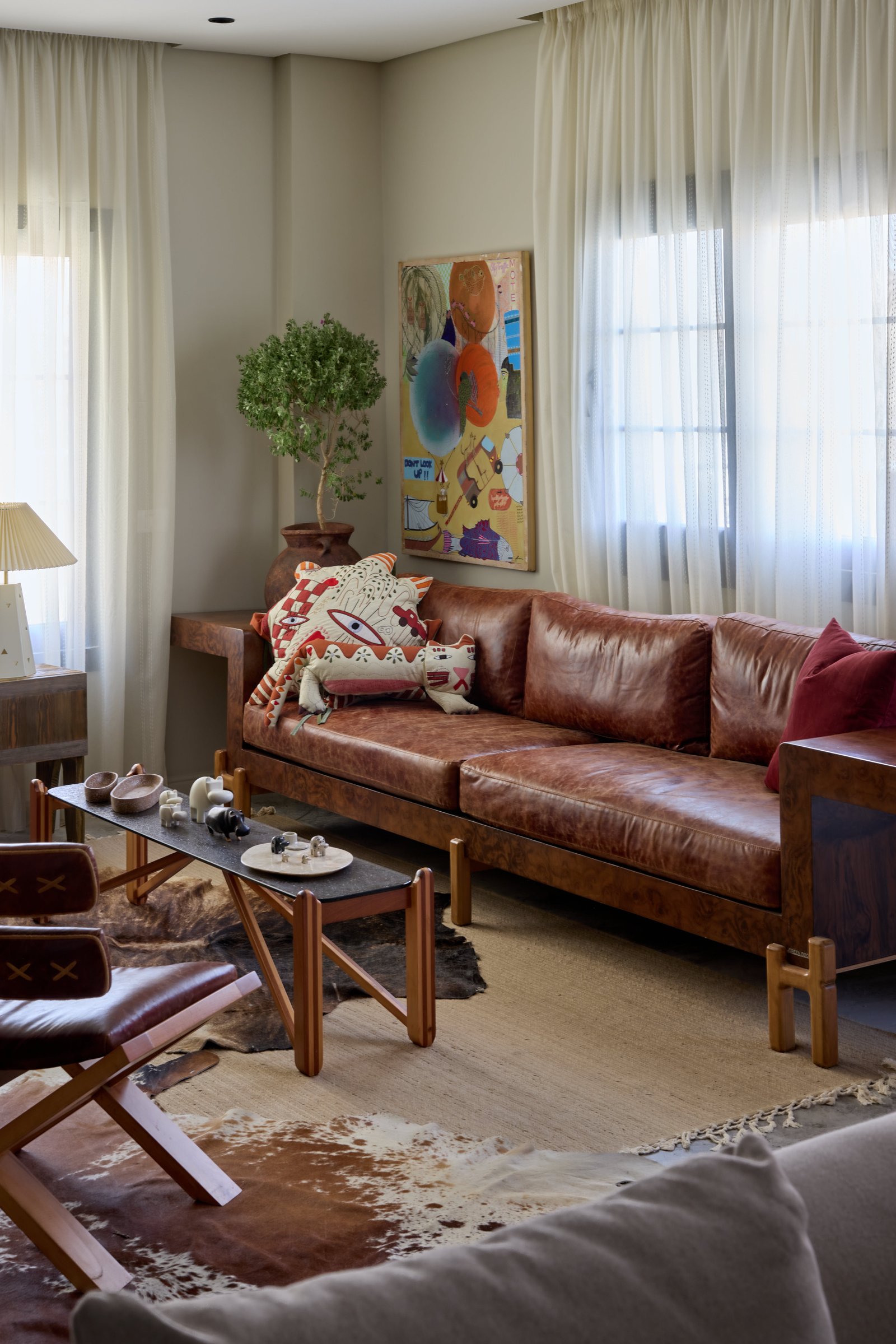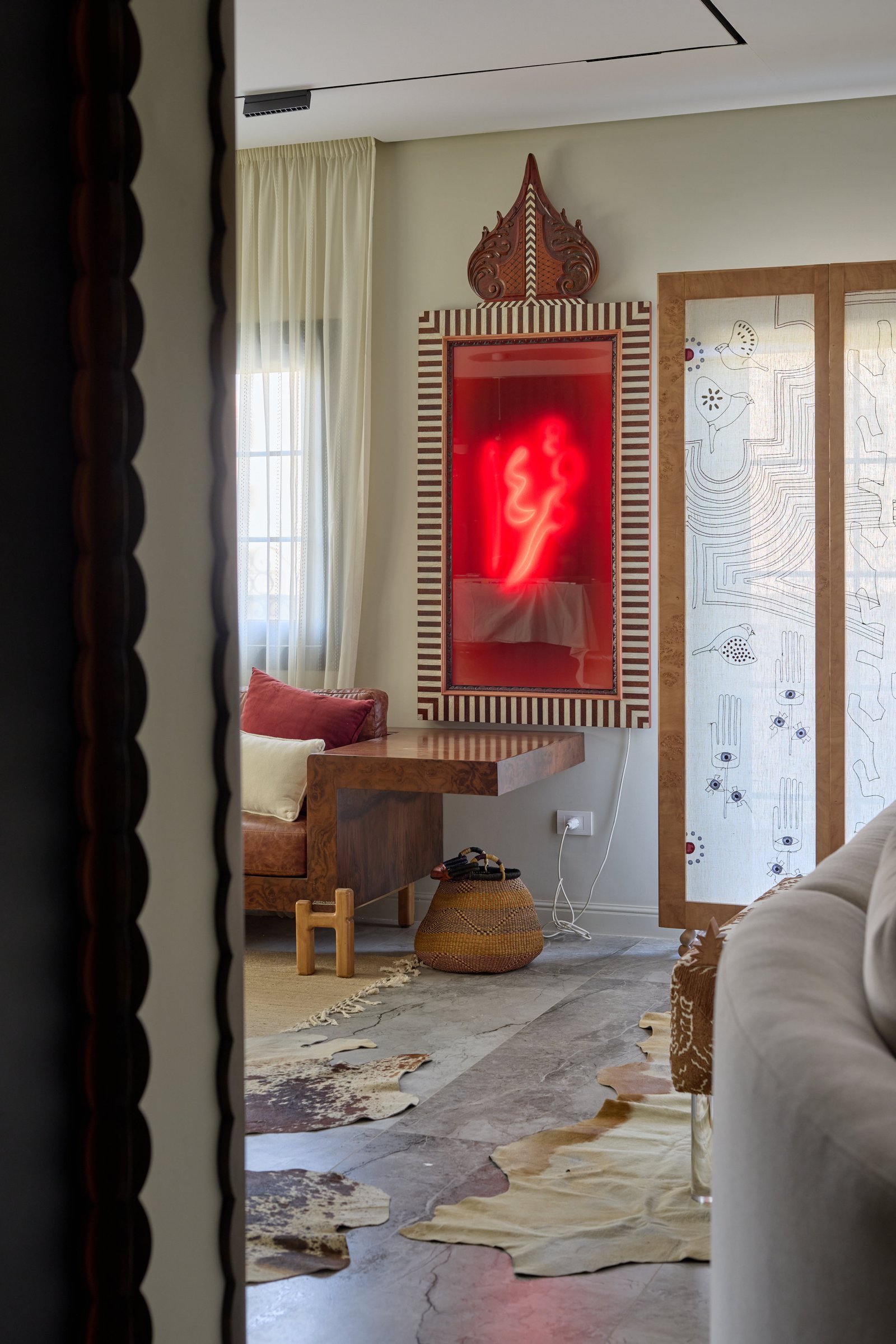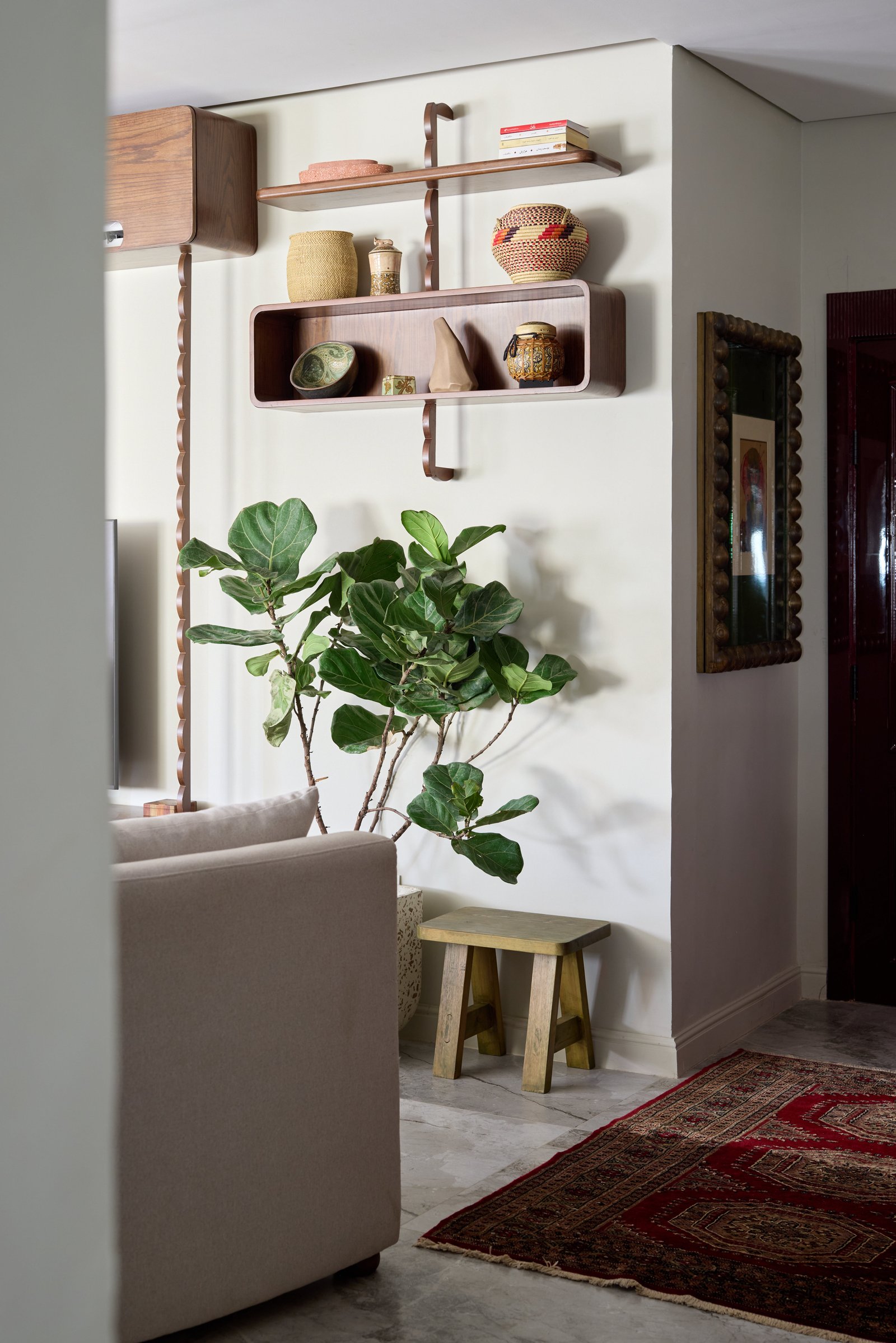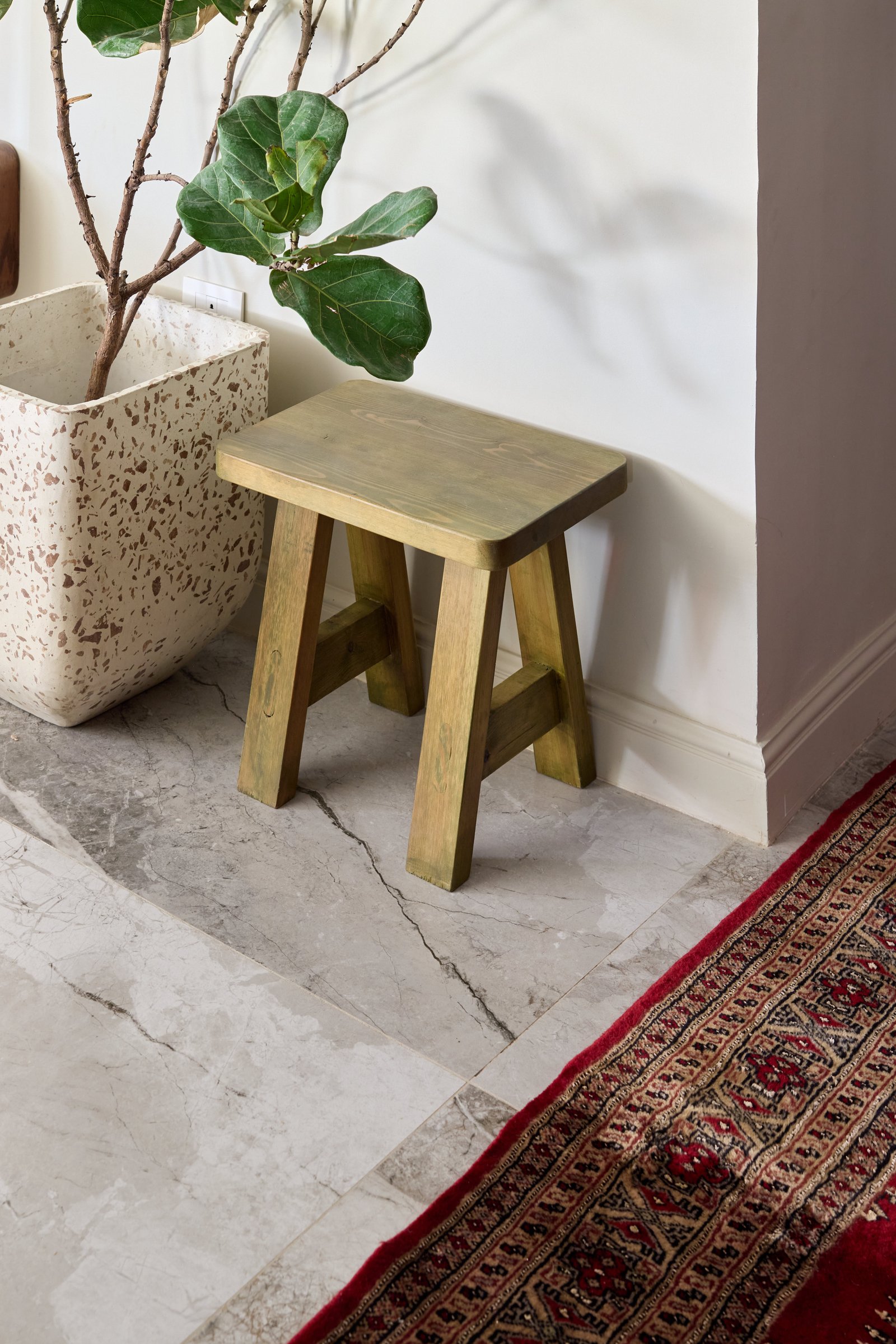 This cozy corner blends natural textures and earthy tones. A green stool and speckled planter with a fiddle-leaf fig add freshness, while marble tiles and a patterned rug bring elegance and warmth. The mix of greenery and traditional accents creates a peaceful, inviting space.